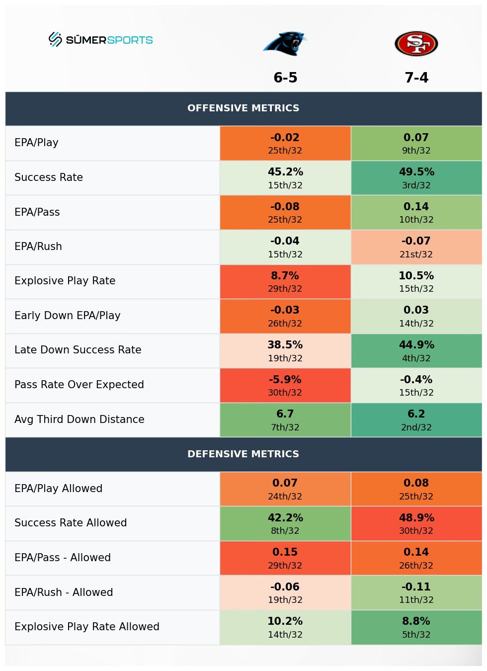 Die Panthers und 49ers belegen ligaweit Platz 31. bzw. 32. in Pressure Rate.Das bedeutet: Beide QBs können unter Umständen in einer sauberen Pocket arbeiten. Ohne Bosa & Warner sollte der Pass Rush der 49ers ihn nicht allzuoft aus der Ruhe bringen.