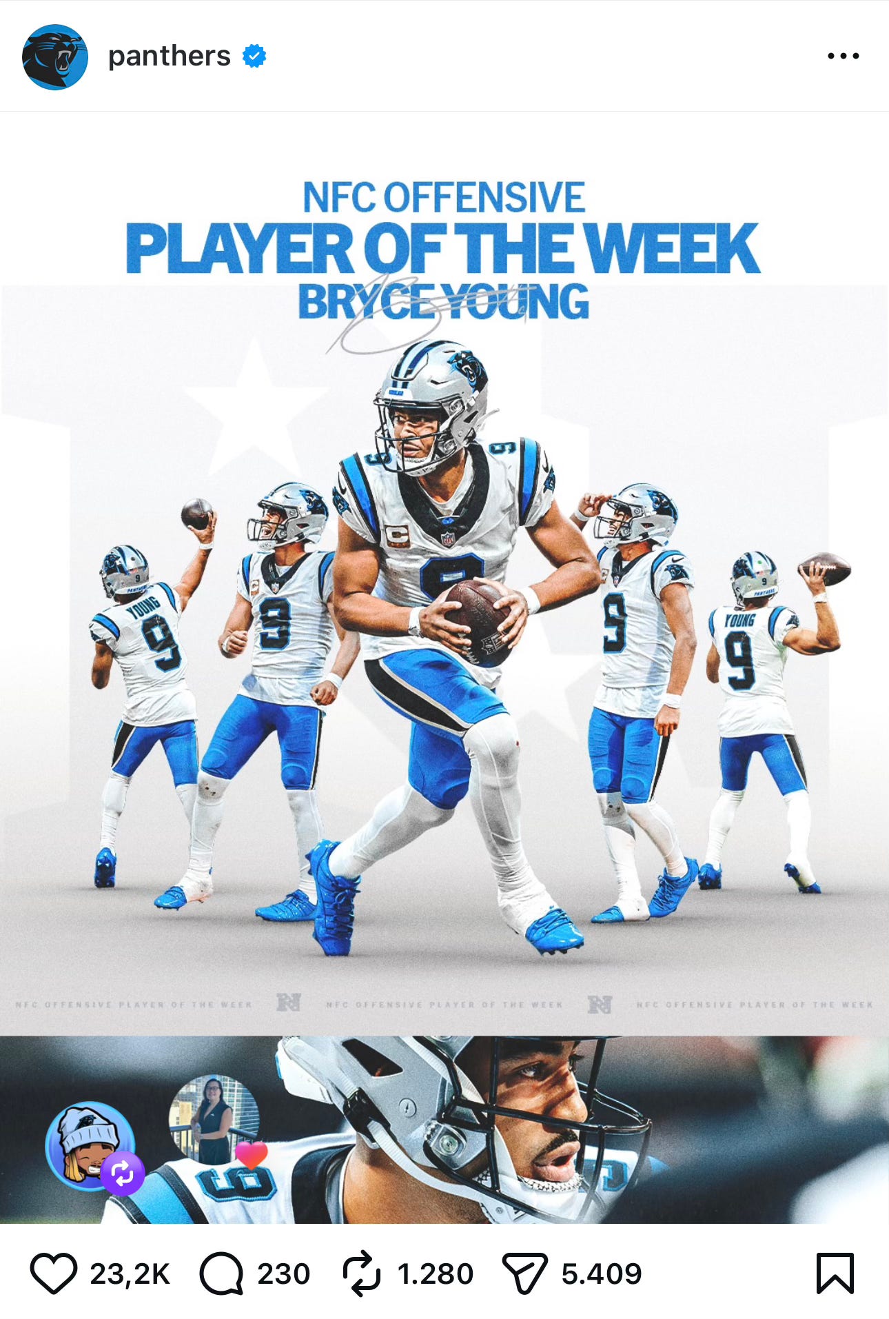 Mit der Ehrung von Bryce Young als NFC Player of the Week wurden die Panthers bereits zum fünften Mal in dieser Saison ausgezeichnet (Rico Dowdle, Ryan Fitzgerald, Sam Martin, Tre’von Moehrig, Bryce Young). Damit ist Carolina das erste Team der Saison mit dieser Anzahl an Auszeichnungen. Zuletzt gelang dies 2017 mit Cam Newton, Julius Peppers, Luke Kuechly, Jonathan Stewart und Damiere Byrd.
